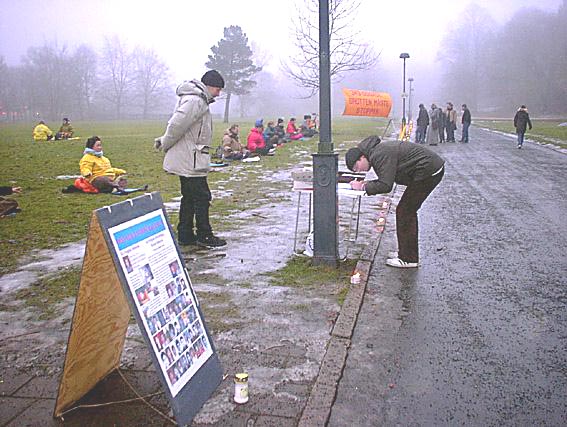 在城堡树林公园的路边,一个写有“343人被迫害致死,这场邪恶必须停止“的横幅和一排长长的烛光吸引了大量的过路人。他们有的仔细地观看展板,有的立即止步阅读刚接过来的有关近期被迫害致死学员情况的传单,有的与学员交谈了解更多情况,还有的主动在我们的呼吁书上签字。