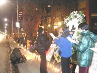 多伦多大法弟子在中领馆举行烛光悼念活动(图) 11日晚上6点正,学员代表宣读了法轮功学员全球连续二日悼念行动及强烈谴责江泽民邪恶集团肆意杀害无辜的法轮功学员的声明。全体大法弟子三发正念清除着破坏大法的一切邪恶,场面威严。