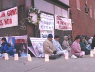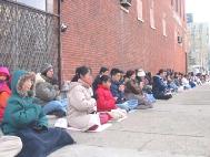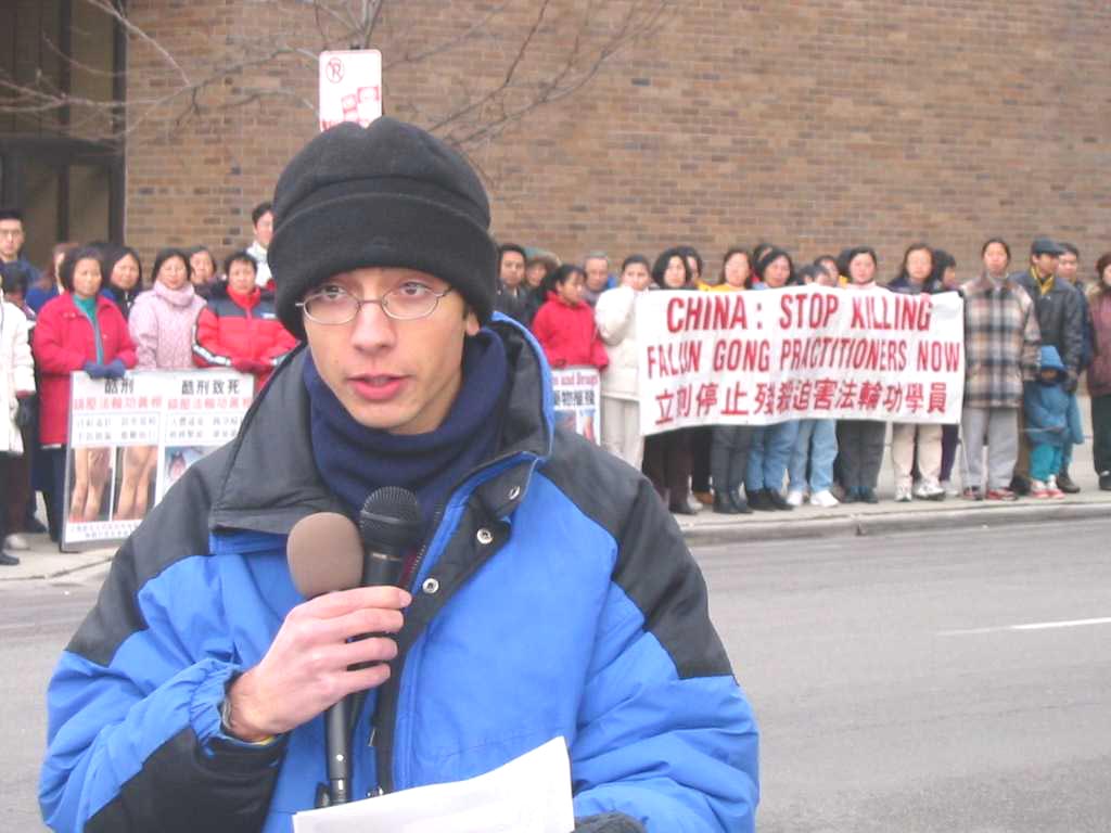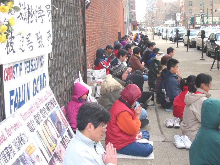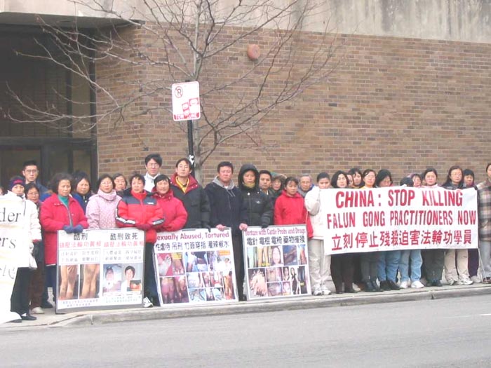 今天有百多名大法弟子齐集中领馆前,其中不仅有芝加哥本地和伊州其他地区的大法弟子,还有不少是从俄亥俄州哥伦布市、俄亥俄州辛辛那提市、密西根州、印第安纳州、密苏里州圣路易市、南达科达州等地长途驱车赶来的大法弟子。他们有的需要开车4、5个小时,有的需要开车近10个小时!由于路途遥远,还有一些外州的学员赶到中领馆时今天的活动已经结束了。是啊,当惊闻在短短的二十多天时间里就有二十位大法弟子被证实被江泽民一伙残害致死时,全世界的大法弟子怎能坐视不理!江泽民对大法弟子的残害,不仅是在摧毁中华民族的善良,宣扬假恶暴在人间的泛滥,更是在触犯天理,极力地把中国人民推向罪恶的深渊。但疯狂的行为也正揭示着江泽民一伙失败前的垂死挣扎。