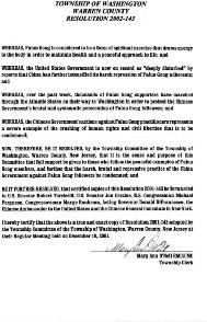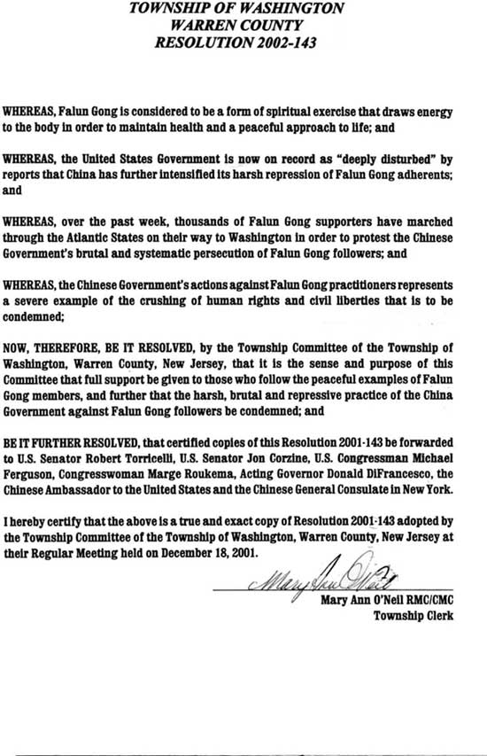 因此,现在,新泽西州,卧龙郡华盛顿市政委员会一致决议,愿意全力支持以和平的法轮功修炼者为楷模的人们,并进一步谴责中国政府对法轮功的野蛮镇压与迫害行为。