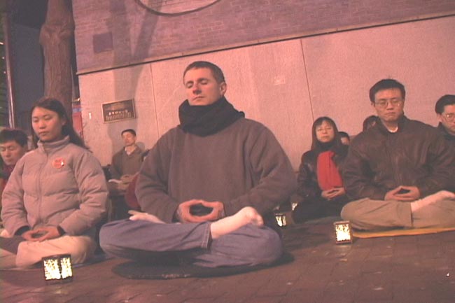 星期六晚上,多伦多法轮功学员在圣乔治街的中国领事馆前的人行道上排成行,叠扣双手,默默祈祷(发正念)。他们身着派克大衣,紧扣双手呈祈祷状,平静地坐在寒冷的人行道边,参加烛光悼念活动。
