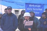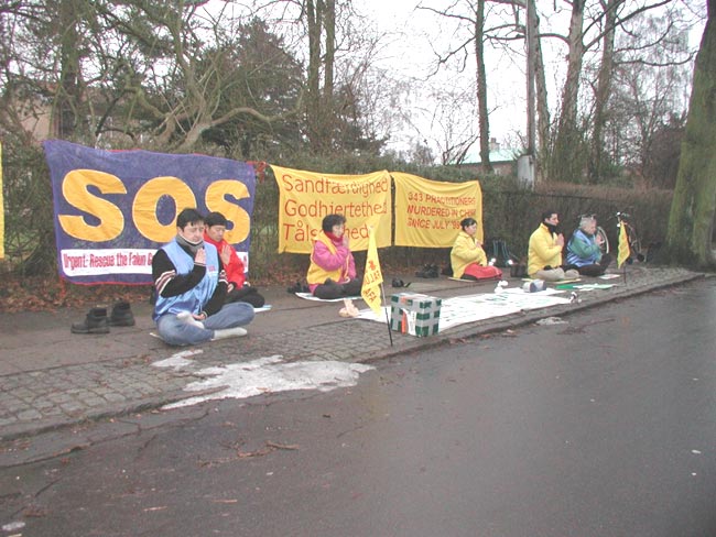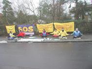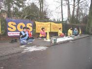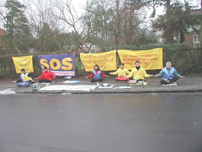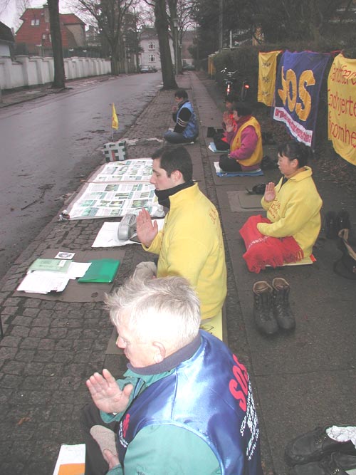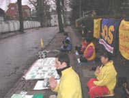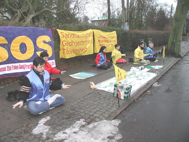 【明慧网2002年1月15日】今天是休斯顿大法弟子在领事馆前烛光守夜,抗议江泽民集团对法轮功学员的新一轮虐杀的第三天。一清早部份学员就来到领事馆前,竖起横幅“停止在中国的虐杀!”,“紧急救援被迫害的中国法轮功学员!”,还有多幅大型的法轮功学员被迫害的图片。然后学员们准备打坐炼功。