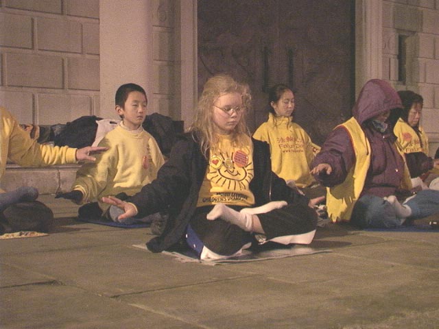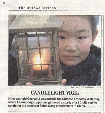 昨天,法轮功支持者们聚集在中国大使馆前,参加全球30个城市共同举行的烛光悼念活动,谴责对中国法轮功学员的虐杀。图为九岁小童乔治·李昨日在使馆外面。