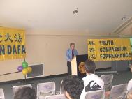 再有一个问题,我们从九九年“七•二零”遭受迫害一直到今天为止,已经能够使全世界的人们都认清了法轮功是什么,都知道我们好,无论是各国政府啊,人民啊,包括跟中国政府关系非常好的那些个国家,它们都清清楚楚知道了我们是怎么回事、迫害大法的邪恶是怎么回事了。那么也就是说,能够做到这一点,那是与你们每个弟子大家共同的努力分不开的。也就是说,在讲清真相中,大家都能够切实的对大法负责,能够在压力面前坚定正念。每个大法弟子都有工作与家庭,所以在方方面面时间都很紧的情况下,一直把大法摆在很重要的地位去做,这是了不起的。由于大法弟子共同的努力,现在的情况不一样了,邪恶是孤立的,就是在中国国内现在也逐渐的在形成了这样一个趋势,人们开始清醒。大家知道,九九年“七•二零”中国国内当初的迫害那是很严重的,没有人敢说一句公正的话,可是现在法轮功学员敢找到迫害的直接责任人,敢直接找各级人物,你迫害我,我找到你告诉你真相,甚至大法弟子在很大的地区,在很多的地区,把这个法正的确实是很可观。就是说整个的形势都在变化,人们都在知道这场邪恶迫害的真相。那么也就是说啊,讲清真相这件事情是非常重要的,每个学员都要重视这个问题。我告诉大家,除了你个人的修炼之外,当前最大的事情就是讲清真相,因为它在直接的普度着众生,它直接的在挽救着未来的人,同时它体现出大法和大法弟子的伟大──在这样艰苦的环境下,你们还在救度着众生。