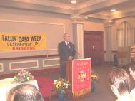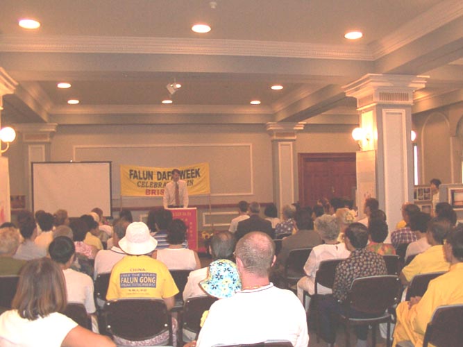 在市政厅礼堂将举行“法轮大法(真善忍)周”开幕仪式“正法之路”图片展览,华裔澳籍画家章翠英女士特从雪梨赶来参加庆典活动,并举行赈灾义卖画展。十点多在热烈的掌声中布里斯本“法轮大法(真善忍)周”庆典开始。出席开幕式的政界要人中的三位相继走上讲台表示庆祝,支持和良好的祝愿。一位警界要人谈到“因为你们所有的活动都是围绕真善忍展开的,所以我信任你们,支持你们。”另一位谈到“做为一个地区的代表,对真善忍的支持,对他们地区的和平正义是有促进作用的。”所以他希望我们继续努力把真善忍的和平价值观发扬光大。第三位议员谈到在中国发生的事使他不可理解,真善忍这么好的理念他们为什么不接受呢?他对我们表示强力的支持。