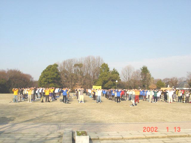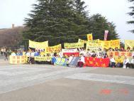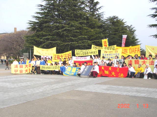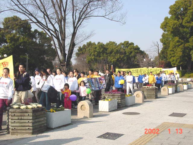 13日是星期天,日本时间的6、7、8点是全世界大法弟子三发正念时间。由于条件所限,学员们只能在旅馆发完正念。之后来到名古屋的名城公园,在这里一上午大家两次集体发正念,然后展示了五套功法。这天名古屋市阳光明媚、温暖如春。中午一点,学员门排成四列纵队,举着“法轮大法好”、“真善忍”、“SOS紧急救援中国受迫害的法轮功学员”、“中国政府停止镇压法轮功”等横幅在普度济世的音乐声中上路。大家在行进中一路发正念,游行队伍平和、慈悲、神圣、庄严,那强大的慈悲祥和的场让许多弟子感动不已,不少弟子泪水止不住地流。道路两旁的路人不断向我们投来关注的目光。一部分学员向路人派发日英中文大法报纸,许多人接过报纸马上阅读了起来。