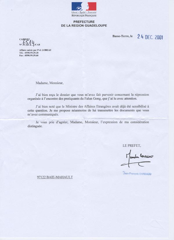 我已收到了你们递送给我的关于对法轮功修炼者有组织的迫害的文件,我已仔细阅读。