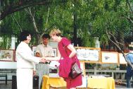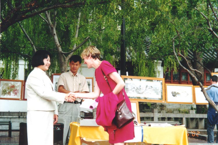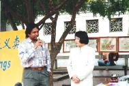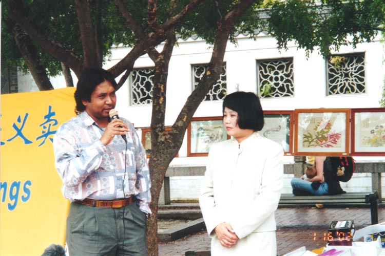 我在世界20多个国家巡回画展,受到了各国政府官员和媒体的帮助。在爱尔兰,市长腾出自己的办公室让我办画展;在日本,议员帮我买机票、租场地,拿出50万日圆,以让我能在日本6个城市进行画展;在英国、加拿大政府议员让我在国会大厦办画展;德国的艺术文化局局长给我们三层楼的楼房免费让我办画展……,想不到,在澳洲为山火灾民捐钱重建家园,举办义展,还要受到XX政府的阻挠,对于这种不公正的待遇,我们所有的善良人们都要起来共同制止。在二十一世纪的今天,这种事情是不应该发生的,这一切的发生,也就是因为我炼法轮功。大家知道,4年前,我因为患严重关节炎,吃饭、走路都困难,失去作画的能力,当我学了法轮功以后,我身体神奇地很快恢复了健康,是法轮大法给了我第二次的艺术生涯。然而,1999年7月,中国江泽民政府开始对法轮功进行镇压,我回到中国北京为法轮功说句公道话,我只说了一句‘法轮功好’,他们就把我关了4个监狱长达8个月,让我过着生不如死、地狱般的牢役生活。狱警的毒打,使我遍体鳞伤,并给我戴上沉重的脚镣。当我仍然坚信真善忍时,他们就把我扔进男区监狱,进行人格的羞辱。一天十几小时的奴役般的监狱苦工,一周七天,不停地干活,还唆使犯人打我,打了我,就给减刑;并让我睡在冰冷的水泥地上,头朝着厕所;吃饭则是从别人的碗里拨一点给我吃,不给我水喝……,每当各国政府官员听了我的亲身遭遇后,纷纷谴责说:‘这样的人权迫害的政府太糟糕,应该把江泽民送上国际法庭!’包括很多市长纷纷来信,要严励惩罚这样的人权迫害狂!因为我是澳洲公民,才得以在澳洲政府的营救下,使我能活着从中国监狱里出来,而中国大陆千千万万的法轮功学员,却没有这样的机会,他们甚至被活活害死在监狱里。现在的中国法轮功学员,他们的生命每分钟都受到威胁。我们呼吁全世界善良的人们,帮助我们共同制止这场邪恶的迫害,世界需要真、善、忍,生命需要真、善、忍,人人需要真、善、忍,尤其今天的社会需要真、善、忍,,让我们共同维护人权,把江泽民送上国际法庭!制止邪恶!”