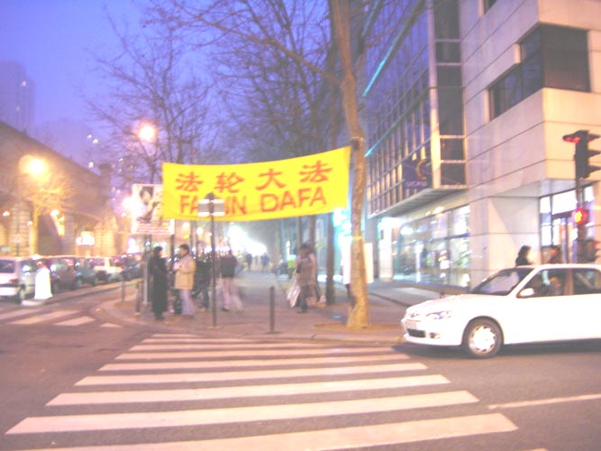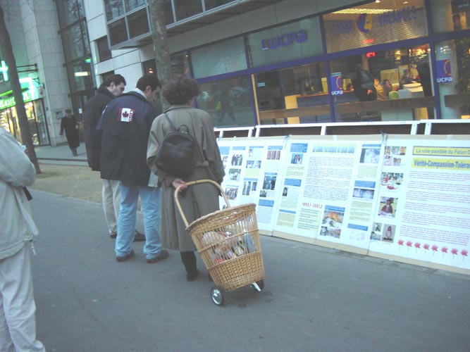学员们准备了中文的“回归的旅程”、中文的真相VCD和法文的SOS洪法资料。我们高兴地发现,大多数留学生都十分乐意接受洪法资料,还往往是笑脸相接。正如师尊在《在美国佛罗里达法会上的讲法》中所说:“大家都发现现在跟世人再讲迫害真相的时候,世人就不那么麻木了,也喜欢接受了”。他们当中不少人不是匆匆而过,而是驻足仔细观看展板,或和学员长谈了解真相,还有的询问哪里可以买到大法书籍、哪里有炼功点等等。学员们常常善意地提醒留学生们:“请把资料收好,不要让教育处的人看到。”他们也往往会心地报以微笑:“哎,对!”有一对夫妻女方感到难以理解:“为什么?我们不是在法国吗?为什么不能拿法轮功的资料?”男方则无可奈何:“咳!你不看看你要去的是什么地方!”可见江泽民“人权恶棍”的头衔儿名不虚传。
