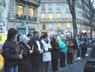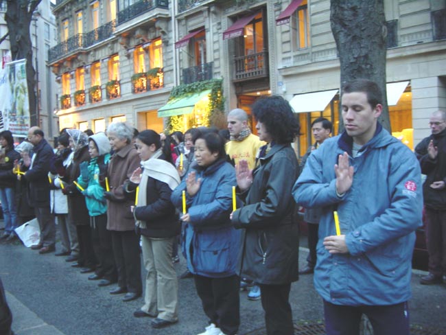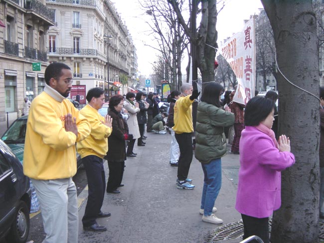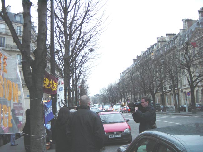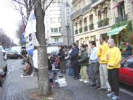 街上来来往往的行人纷纷表示支持法轮功、强烈谴责江罗集团的镇压。他们有的感谢法轮功向当今的世人教授“真善忍”,有的由衷地赞美“真善忍”,有的主动在请愿书上签字。许多去领事部办手续的中国人特地来到街对面,高高兴兴地索取法轮功真相资料和VCD。不少法国人不约而同地表达了同一个心声:对如此残暴镇压佛家修炼人的江罗集团操纵下的中国政府的领事馆设在他们的城市表示耻辱和愤怒!