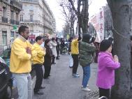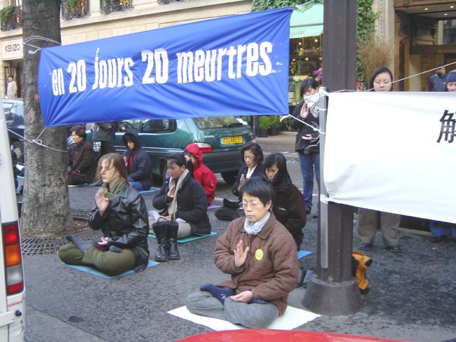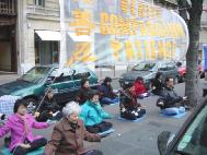 洪法活动其间,学员反复炼功、发正念、用中、法文宣读声明并揭露江罗集团对法轮功学员的残酷迫害。