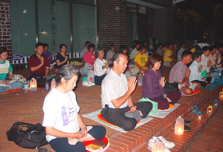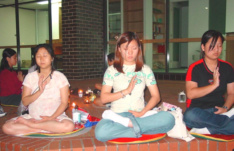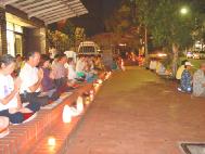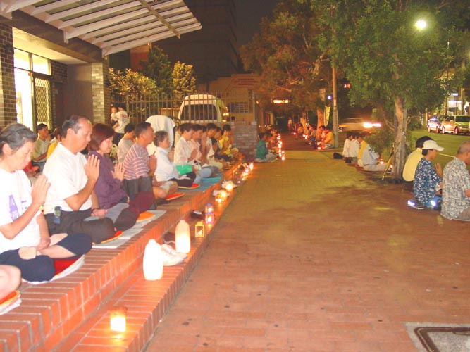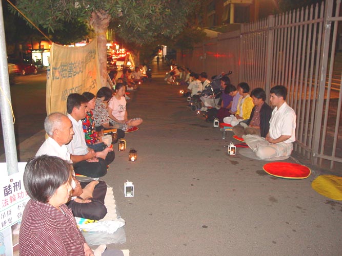 【明慧网2002年1月2日】2001年12月31日晚7时至12时,在全世界范围内迎接新年到来之际,在这具有特殊意义的时刻,伴随著色彩斑斓震耳欲聋的焰火,悉尼大法弟子在中国驻悉尼总领馆前举行了烛光守夜行动。期间每逢整点发正念。整个守夜行动一直笼罩在祥和平静的气氛当中,弟子们的心态也非常纯正。置身在这种纯正祥和的场里,仿佛自己要被融化了。参加这次守夜的约150人,其中有些是新面孔,说明又有学员在不断地走出来,投身正法的洪流之中。