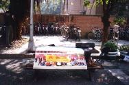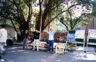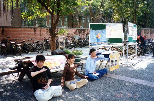 台大法轮功研究社是1999年底提出申请,2000年初通过,现在2002年初,社龄至今已有两年。为方便尚无早起习惯的大学生参加学功,在2001年成立中午时段的炼功点,地点就在台大学生中午用餐时段人潮汇集之处的「小福广场」,另一方面,为配合正法的进程、强化讲清真相的力度,台大法轮功研究社向校方申请为期两周的弘法活动。申请批准之后,在功友们的支援下,各式弘法材料、挂历、看板架等等都陆续汇集起来,并在每日中午下课铃声作响之前便将场地布置好。几乎能抽空来的法轮功研究社成员都到齐了,大家分工合作进行功法展示或发送传单、讲清真相。