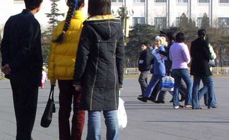 美联社图片二:人们观看着数名便衣警察和一名穿制服的警察带走一位灰白头发的外国法轮功支持者。这位女士戴着写有“法轮功”和“SOS”字样的饰带,于2002年1月23日星期三在北京天安门广场上抗议中国对法轮功的镇压。她被迅速推入一辆守候的警车后拉走。