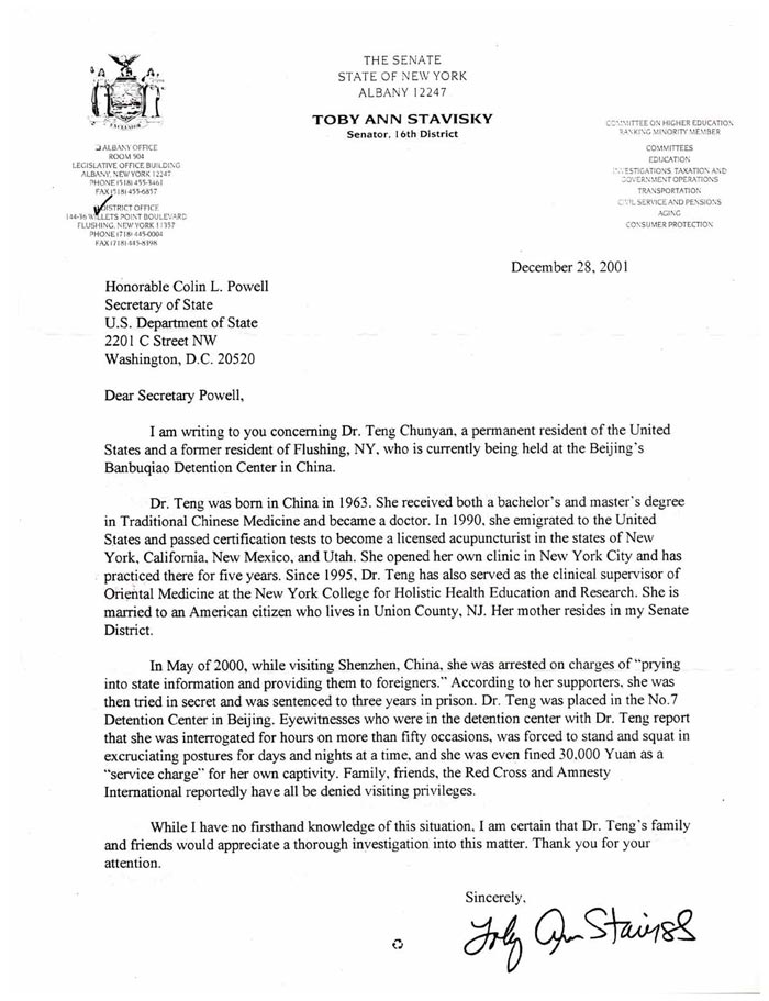我写信给你是因为滕春燕医生之事,滕春燕是美国的永久居民,法拉盛原居民,现被关押在中国半步桥拘留所。
