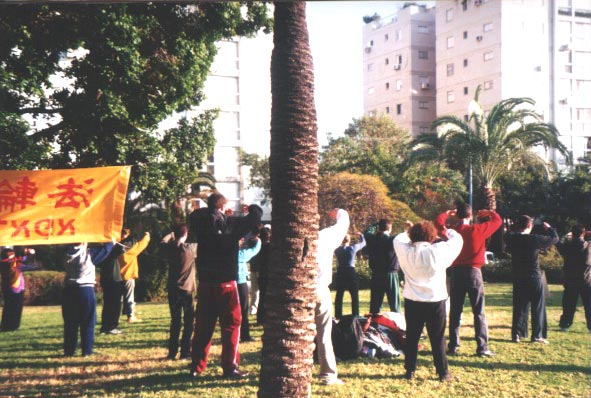会前早晨八点时学员们在公园集体炼功。心得交流时八位学员和大家分享修炼体会和对大法的理解。每三位学员发言后大家集体发正念。