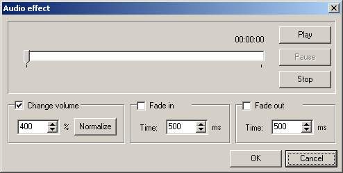 4. 选中“Change volume”(改变音量),然后在下面的框中设置好要调整音量为原音量的百分数。(大于100%为加大音量,小于100%为减小音量。)实践中发现此值需设置很大或很小时,音量的变化才会明显。