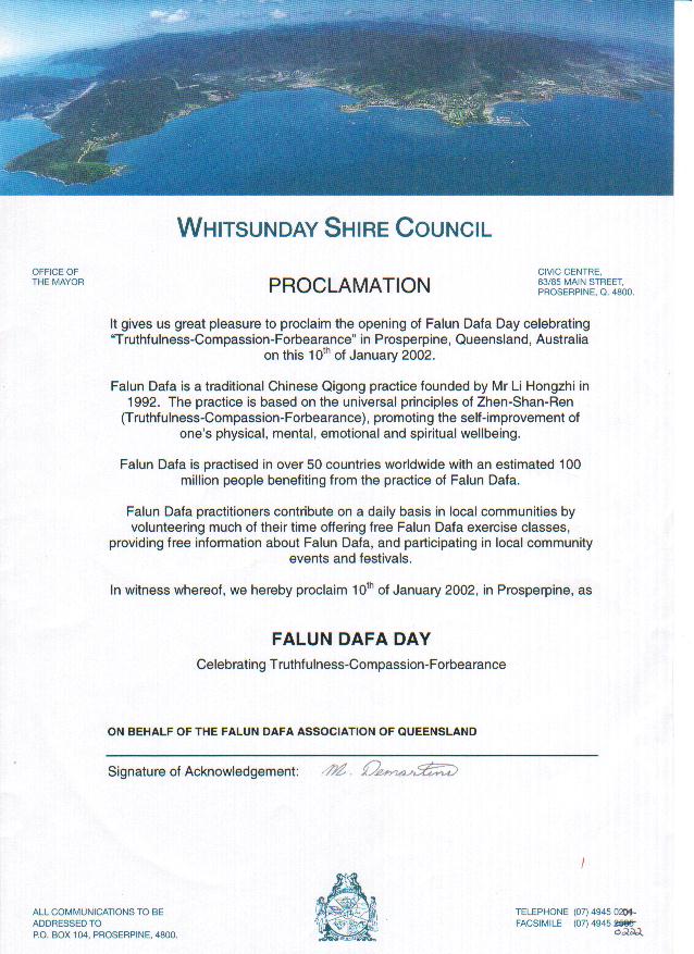 【明慧网2002年1月27日】澳大利亚昆士兰普鲁士畔市宣布2002年1月10日为“法轮大法日”。