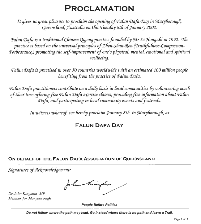 【明慧网2002年1月27日】澳洲昆士兰省议员约翰·金斯顿先生宣布2002年1月8日为马力布拉夫市“法轮大法日”。