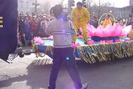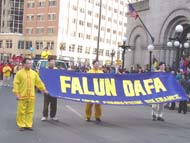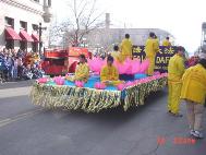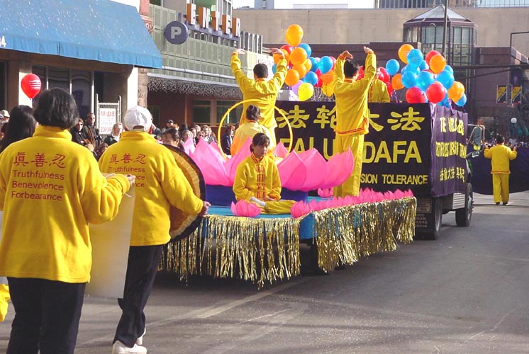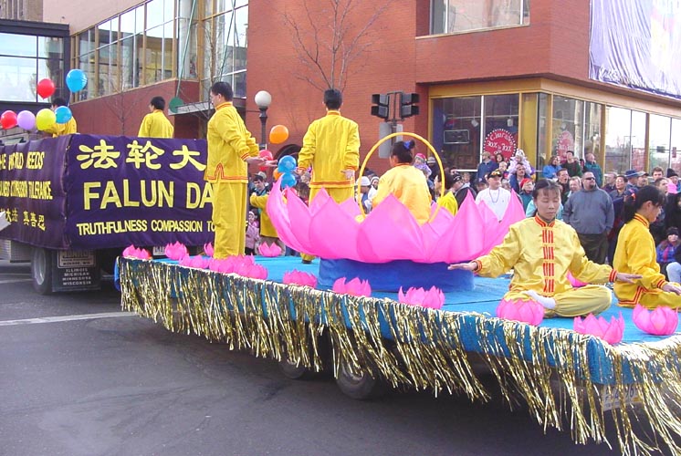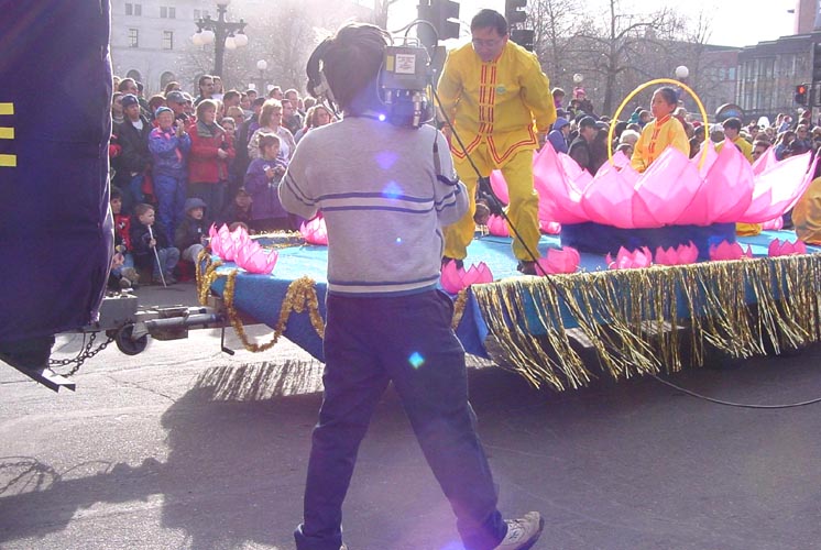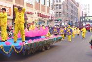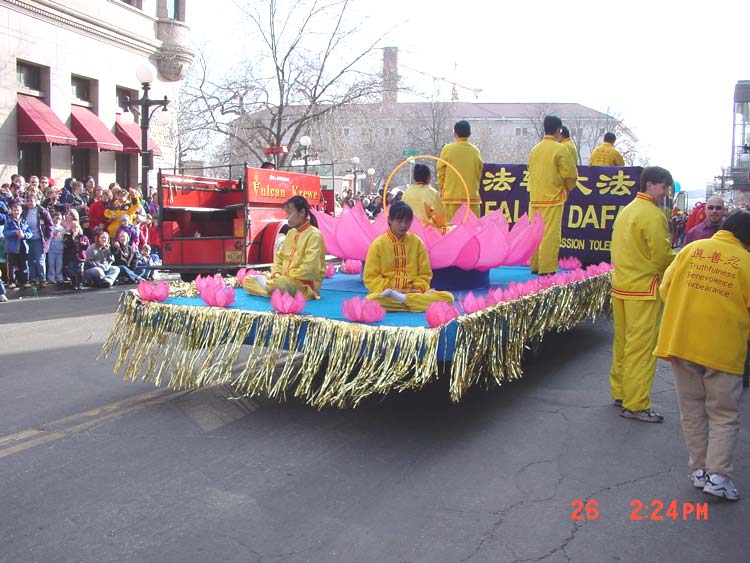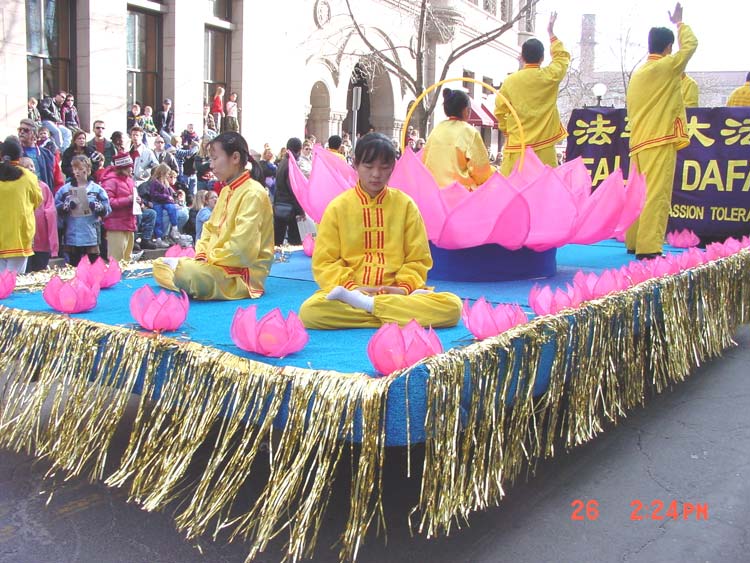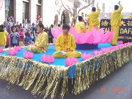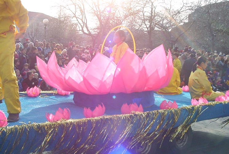 缓缓前行的花车风格各异,增加了节日的喜庆。当法轮功的花车伴随着普度的优美音乐渐渐出现在人们的眼前时,人们的脸上现出格外的喜悦,专注而略带惊喜的目光注视着那画一般美丽的仙境。只见一朵直径约七英尺的巨大莲花位于花车的中央,花车的四周是一些均匀分布的小莲花。一个满脸稚气的小女孩身穿黄色的炼功服坐在巨大的莲花中央,正在静静地打坐。大莲花的四周有两位男学员演示第一到第四套功法和两位女学员演示第五套静功。在和煦的阳光映射下,色彩鲜艳而柔和的粉色莲花,显得圣洁而高雅,恬静而自然。如果不是亲眼所见,还真以为是一幅充满诗意的画。
