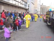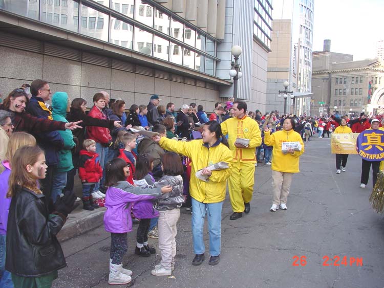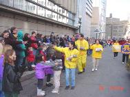 人们被这宁静而美丽的人间仙境所感动,不时发出阵阵掌声和赞叹声,很多人高高举起手臂用食指和中指形成一个“V”字(英文胜利一词的第一个字母)向法轮功学员表示鼓励和祝愿。很多人兴奋而略感自豪地告诉向观众赠送法轮功资料的学员:“法轮功!我知道!”。一只只主动伸过来索要资料、黄色纪念章、和气球的手,忙坏了法轮功学员,尽管有将近20名法轮功学员在不停地把资料递到人们的手中,还是有人没能拿到资料。随着游行队伍的前行,印有法轮大法字样的气球拿在了小孩子们的手上,漂浮在人山人海的观众中。
