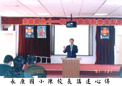 参加研习的校长、教师,听了李老师的讲法,学了五套功法之后,在最后综合座谈时,永康国小陈校长,提到他在这五天当中,除了看《转法轮》之外,还看李老师教功录像带学炼功法到晚上12点才休息,这种精进的精神,实在令人敬佩。陈校长还对大家做了一项调查,请在这五天当中有反应的教师举手,结果竟然超过三分之二的教师都举了手。陈校长很惊讶地说怎么他都没感应到,但是他对李老师的讲法很是折服,因此,当有一位教师提出每个月大家聚会一次,讲述这个月的修炼心得时,陈校长当场答应由永康国小来办理,并约定下次聚会之时间,且要求大家不可以缺席。