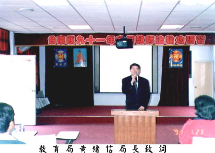 台南县政府教育局黄绪信局长在第二天特别到场致词,他很高兴有上百位教师自愿要来参加法轮功研习,黄局长勉励参加研习的教师,要把「真、善、忍」的精神带回各学校,教育下一代,使学校、社会更加祥和。教育局长听到经他核准的下一场教师法轮功研习,已有160位教师报名,笑得更是开心,直说“赞”。