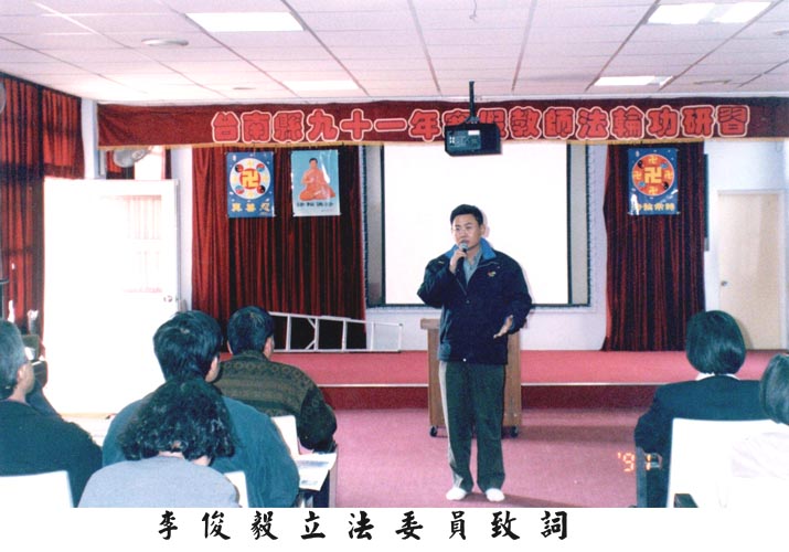 值得一提的是,竞选国会立法委员连任的李俊毅立委,到场向参加研习之教师致意。李立法委员平日就很关心法轮功,对法轮功的「真、善、忍」精神及“打不还手,骂不还口”特别有好感,特地赶早至会场与大家见面。