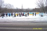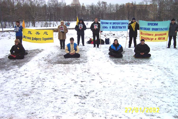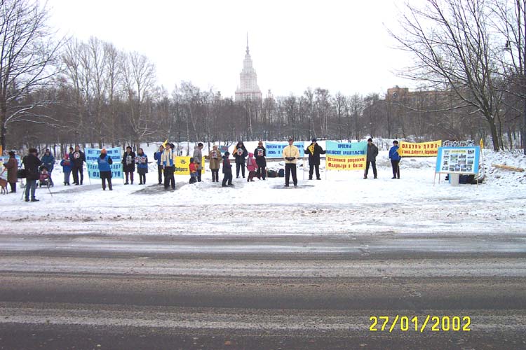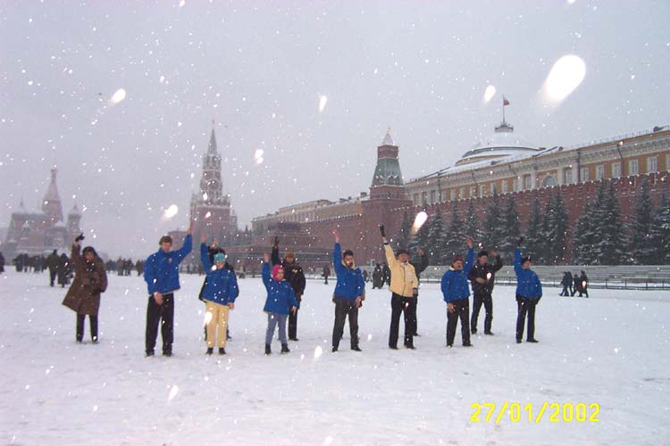这次集会得到了莫斯科地区政府的批准。在大使馆值班警察的允许和陪同下大法学员的代表进入大使馆的围栏直接到使馆接待室门前向大使递交抗议信。几次叫门大使馆的工作人员竟躲在玻璃门内不敢出来。 学员们向过路人发放真相资料,俄罗斯人们都很关切地注视着在中国发生的一切事件,认真地听学员向他们讲真相。 在使馆前的抗议集会结束后,学员们又来到克里姆林宫前的红场上,向世人展示功法、发正念和合影留念。
