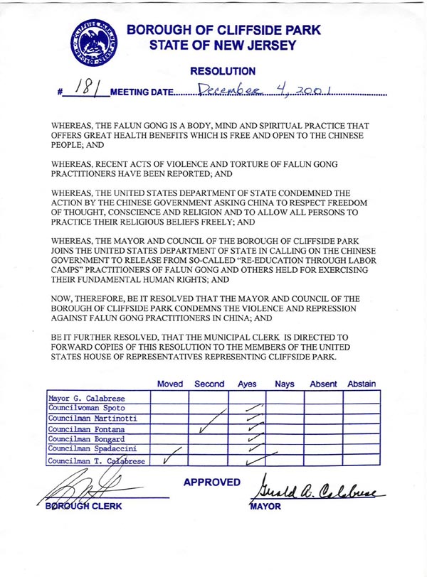 【明慧网2002年1月4日】2001年12月4日,新泽西州崖边帕克镇镇长和镇议会一致通过决议,谴责中国对法轮功学员的镇压和残酷
