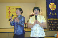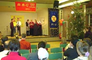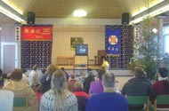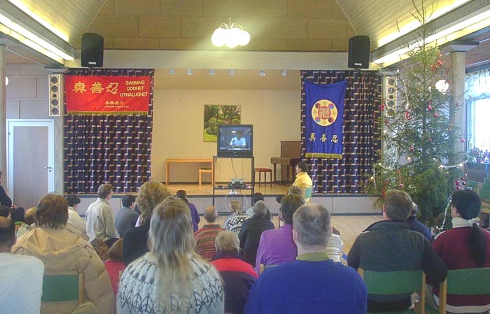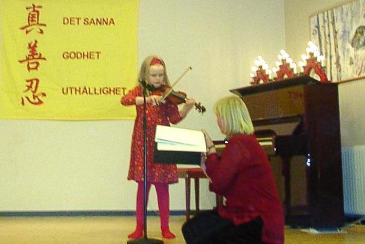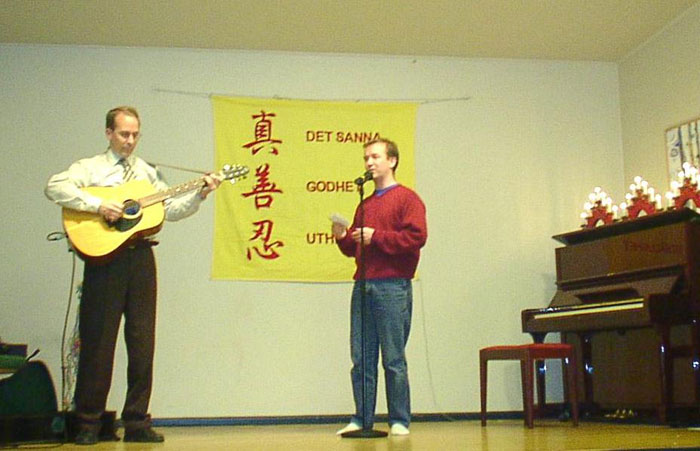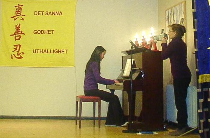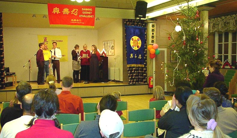 新年除夕,大法弟子们欢聚在师父6年前在哥德堡讲法的地方,举行了辞旧迎新的联欢会。学员们用诗歌、舞蹈、钢琴独奏、小提琴独奏、小合唱、杂技和小品等歌颂了大法的神圣和师尊的洪大慈悲。一曲现场学会的“法轮大法好”将联欢会推向高潮。大法弟子们诚挚地一遍又一遍高唱“法轮大法好”。联欢会在大法弟子们零点左右发出的强大正念后,圆满结束。