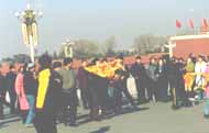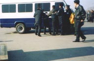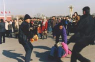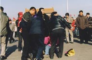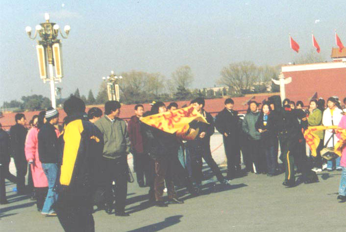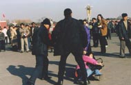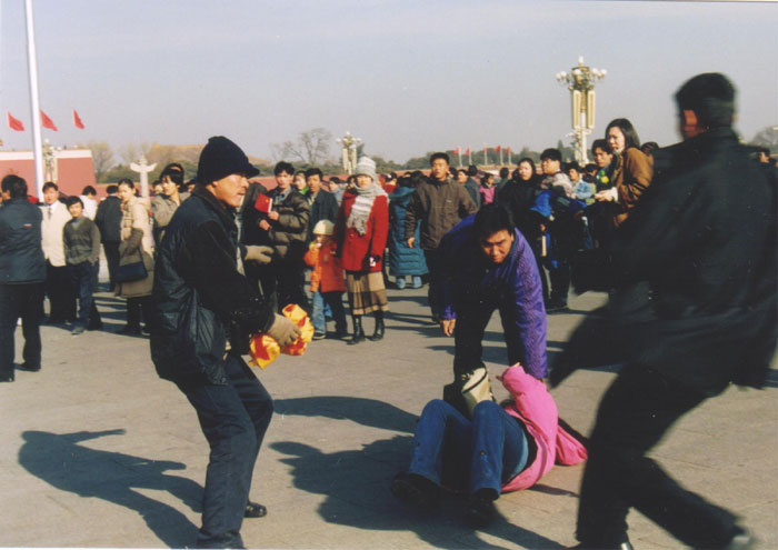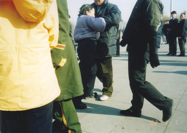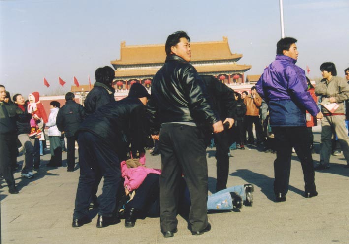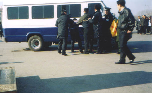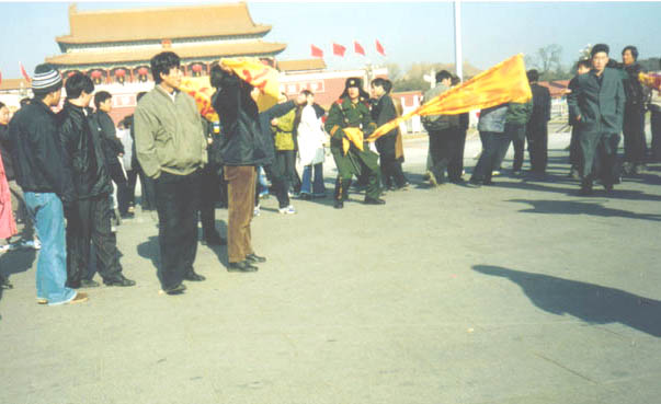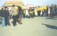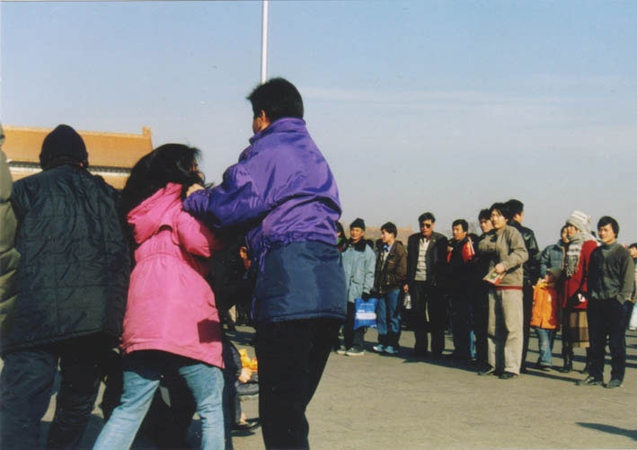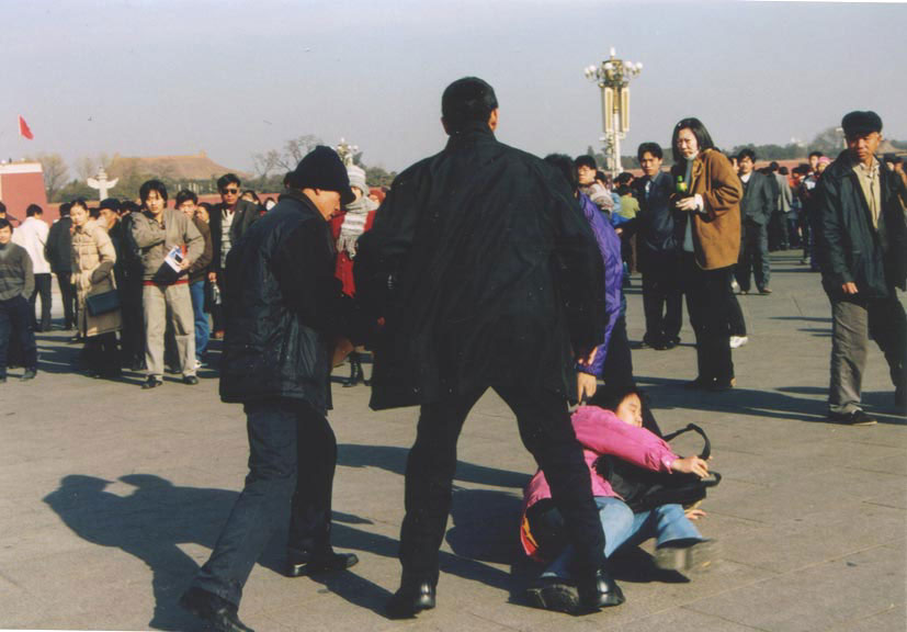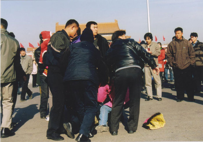 一位残疾女大法弟子打横幅时被邪恶的便衣抓走