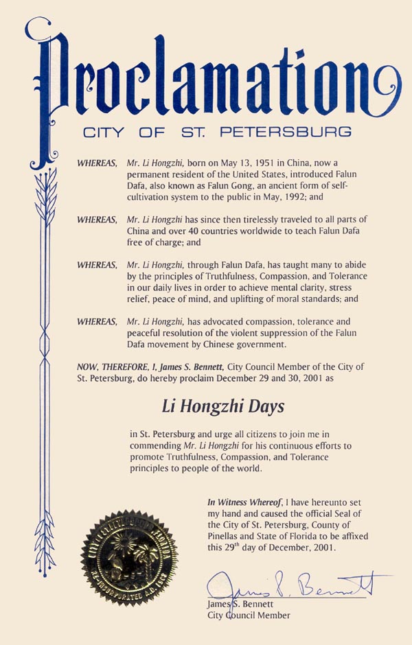 鉴于,李洪志先生通过法轮大法,教导许多人在日常生活中遵循“真、善、忍”的原理而获得精神净化,压力减缓,心灵平静和道德水准提升;并且