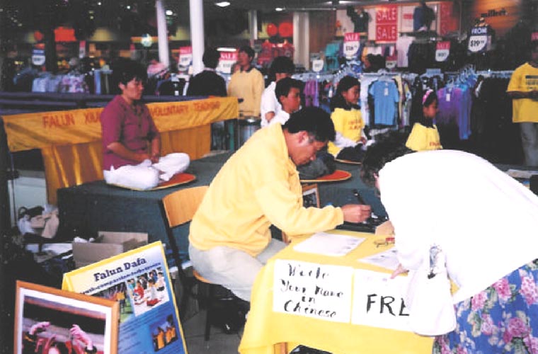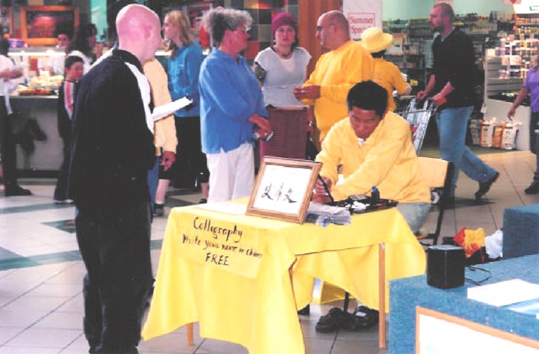 在上星期的塔斯玛尼亚洲霍巴特市“真、善、忍”周洪法活动中,也明显看出这一方法的作用。竟在一中型购物中心的功法示范等两天的洪法活动就写出了印有“真、善、忍”,“法轮大法”中英文和网址、莲花等图案的单张六百多份。如果旁边站有英文好的学员讲真相和发资料,效果更好。这时大部分等候索字的人都会签字支持我们。但应注意不要带有一颗使人觉得我们在要求别人进行交换的心。同时为了活跃一些,也可简单解释一下名字中的文字意思。