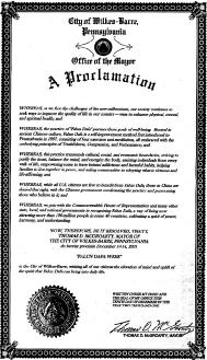 因此,现在,决议,我,汤姆斯.D.麦克歌若台(Thomas D. Mcgroarty),宾夕法尼亚州维尔金斯-巴瑞市市长,宣布2001年12月10日至14日为本市“法轮大法周”,同时希望市民们通过学习法轮大法提升道德水准和改善精神生活。