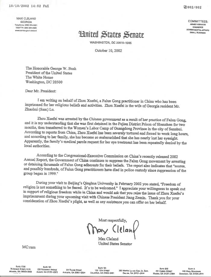 您于2002年2月访问北京的清华大学时说,“宗教自由不应让人惧怕。它应该受到欢迎。”我感谢您能够在中国为宗教自由而大胆直言,并希望您能在不久与中国国家主席江XX会谈时提出周雪菲被监禁一事。谢谢您关注周雪菲的困境,同时也谢谢您能为她提供任何的帮助。