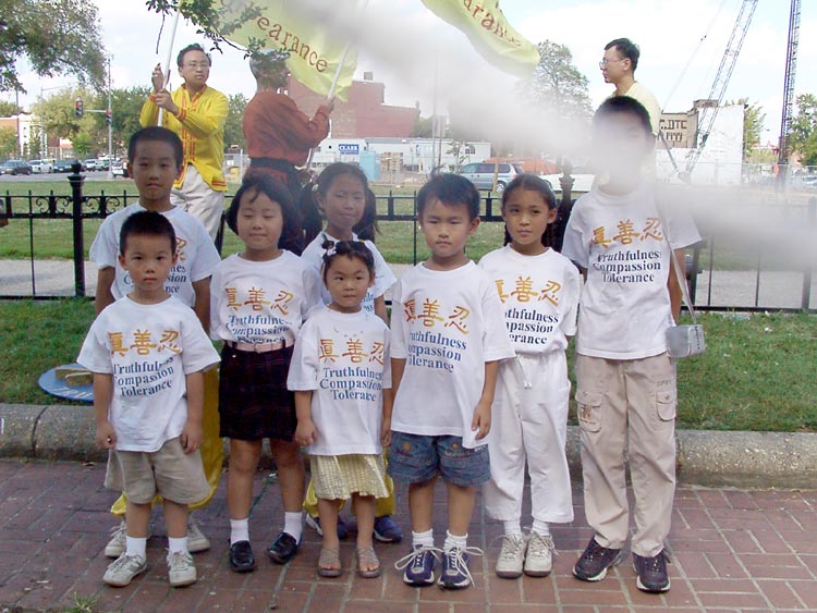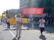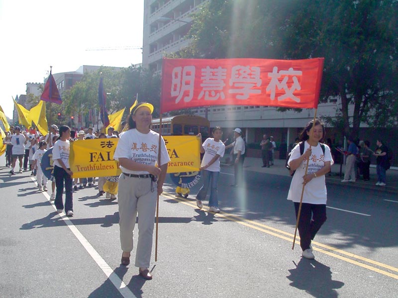 游行在下午2点正式开始。队伍中可见明慧学校师生们,举着法轮大法的横幅和真、善、忍三个字,队伍一有停歇时小朋友们就开始表演第一套功法。大孩子们则参加了舞龙队,打鼓的打鼓,舞龙的舞龙,他们个个穿着大法黄T恤,腰系蓝带,精神抖擞,兴致昂然。其他学员还组成了身着唐服的舞蹈队和功法表演队,在整个游行中颇引人瞩目。游行队伍浩浩荡荡从中华会馆出发,绕行华府主要街道之后抵达H街的讲台前。