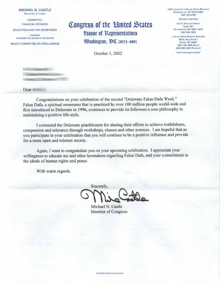 我表彰特拉华州(Delaware)的法轮大法学员以讲座、办班和其他方式与我们分享他们对真,善,忍的追求。我希望在你参加庆祝活动之余,你能一如既往地作为一种积极的影响,为一个更开明,更宽容的社会作准备。