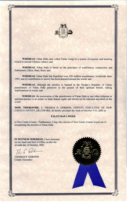 并且我鼓励新城堡郡公民和我一起表彰法轮大法。