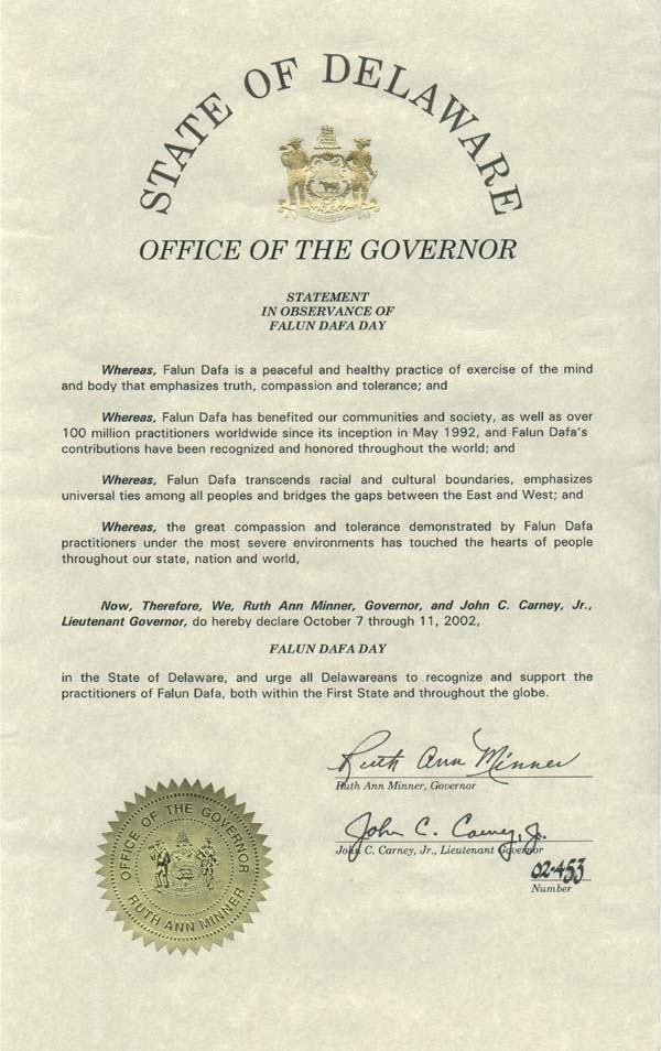 并敦请特拉华居民肯定并支持在这美国第一州及全世界的法轮大法学员们。