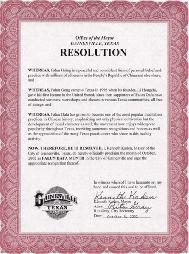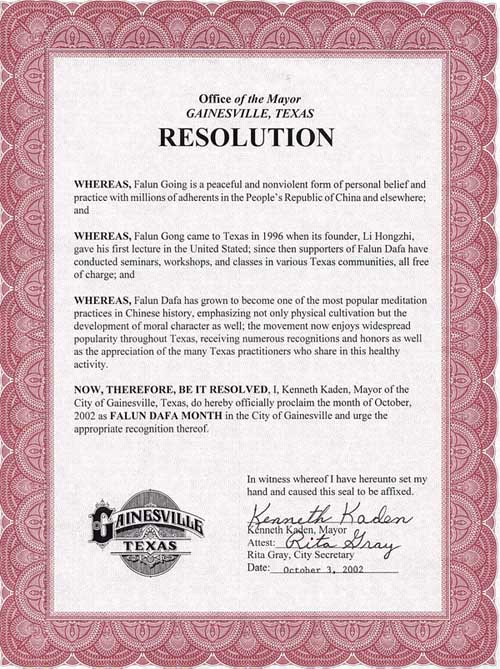鉴于:法轮大法已经成为中国历史上最受人欢迎的一种静坐修炼,不仅强调修身,而且更强调道德品格的提高;该功法在全德州广受欢迎,获得了大量褒奖和赞誉,许多参与这一健康活动的德克萨斯学员也深为人们赞扬。