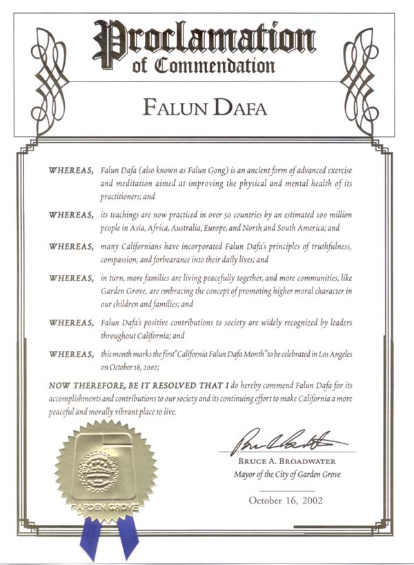 因此,我在此褒奖法轮大法对我们社会的成就与贡献,以及她继续使加州成为更加和平与道德高尚的地方的努力。