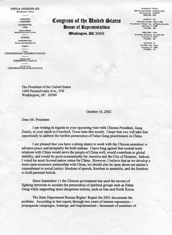 您非常希望能和中国国家主席共同推进两国的和平和繁荣,对此我很高兴。我一直赞同与中国的正常贸易关系会对中国人民有益,对全球稳定有利,对美国和休士顿的经济也会带来益处。我投票赞成给予中国最惠国待遇。然而我相信,在我们与中国建立一个更开放的经济伙伴关系的同时,我们应该坦诚地表达我们国家对社会正义的承诺:即言论自由,集会自由,和拥有个人信仰的自由。
