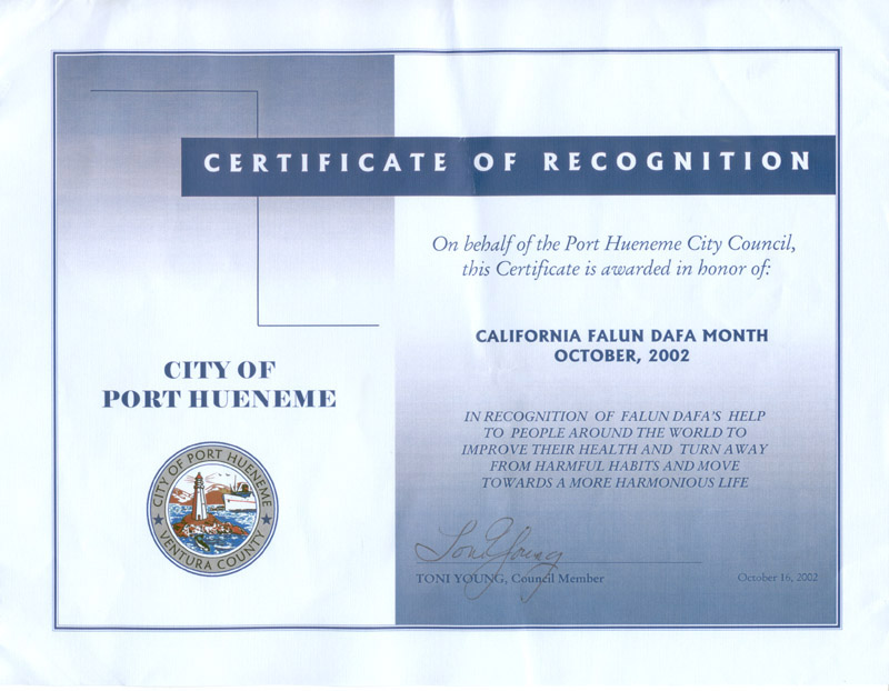 我代表波特.胡恩纳米(Port Hueneme)市市议员,此证书被授予表彰