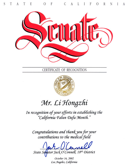 加州参议院议员欧·康奈尔先生褒奖李洪志先生