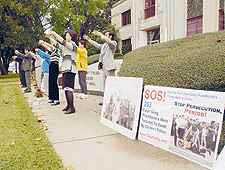尽管只有一名记者参加了这星期六在泰勒市政厅台阶上举行的新闻发布会,一个源自中国的打坐功法的15名学员说,他们准备让布什总统于星期五在其克劳福德农场会晤中国国家主席期间听到他们的心声。