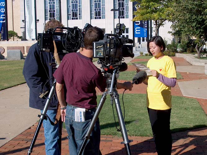 10月20日早上,阳光明媚,风和日丽。我们在市政府大厦门前举行了新闻发布会,俄克拉荷马州的两家主要电视台进行了现场采访,并将在当天下午5点、5点半或晚上10点的新闻播出。这两家媒体都是第一次听说法轮功和法轮功学员在中国的被迫害状况。邱楠楠还用她家庭成员因修炼法轮功而在中国遭受迫害的真实故事向他们讲述了中国江氏集团迫害的残酷,和国际声音对减轻中国大陆法轮功学员的压力的有效性。她向当地媒体介绍了加拿大政府对法轮功的支持和成功地营救出了5位法轮功学员,其中包括她的父亲。之后,我们向记者赠送了莲花,寓意着法轮功学员面对残酷的迫害,仍然保持圣洁,高贵的精神,并希望他们能帮助呼吁美国政府积极参与营救法轮功学员的行动。