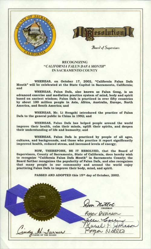 鉴此,加州沙加缅度郡镇长董事会希望能在沙加缅度郡庆祝“加州法轮大法月”;董事会还表彰法轮大法深受欢迎,我们社区的许多居民和世界各地的人们喜欢通过炼习法轮功来提高他们的身心健康。