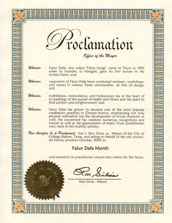 鉴于,法轮大法已成为中国有史以来最受欢迎的修炼功法,他不仅强调修身,更强调心性的提高;这一功法获得了众多的嘉奖和荣誉,参与此健康活动的许多德州学员也受到人们的赞许;