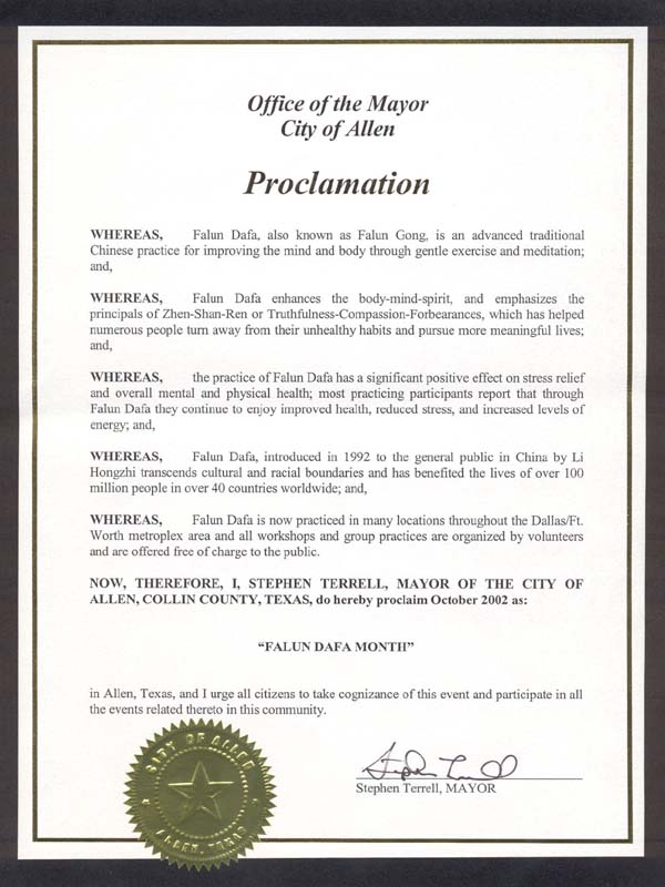 鉴于,现在达拉斯/沃斯堡(Dallas/Ft. Worth)的许多地区都有法轮大法学员,而且所有的讲座和集体炼功都是由自愿者组织,免费提供给公众;